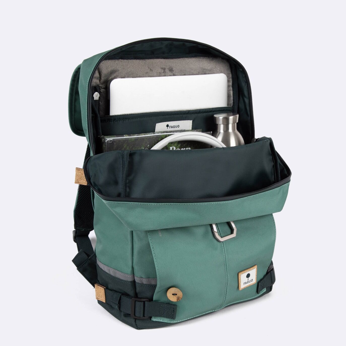 Plecak Commuter dla mężczyzn wyprodukowany przez markę Faguo to kompaktowy i funkcjonalny plecak zaprojektowany z myślą o podróżach rowerowych. Posiada wzmocnione plecy i wyściełane szelki dla optymalnego komfortu. Dodatkowo ma specjalną przegrodę na kask oraz odblaskowe elementy dla bezpiecznej jazdy.